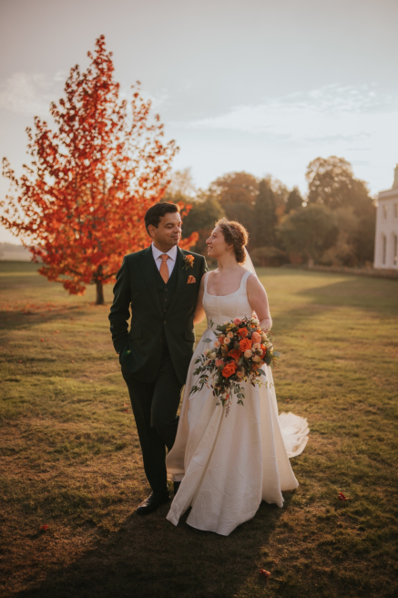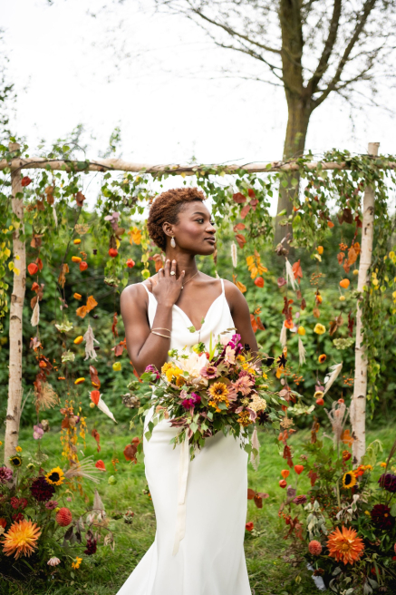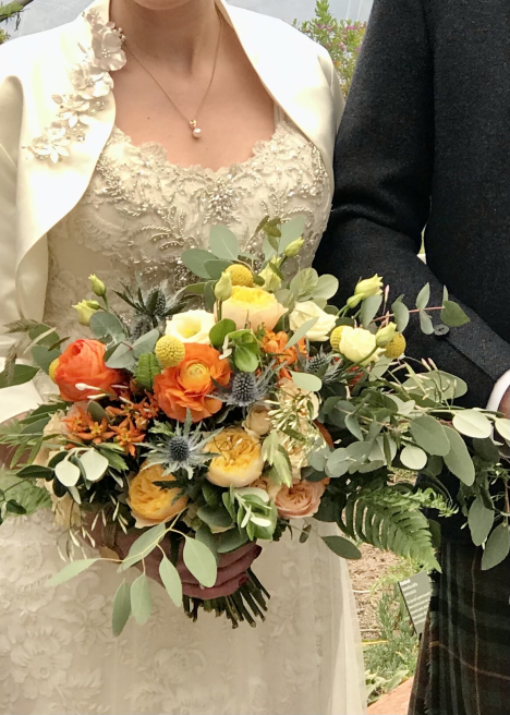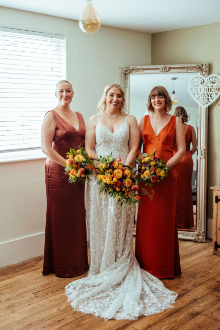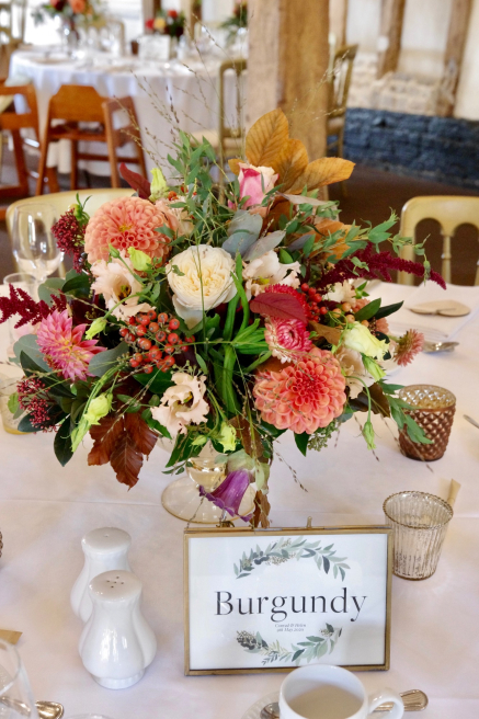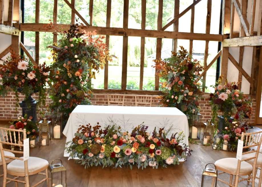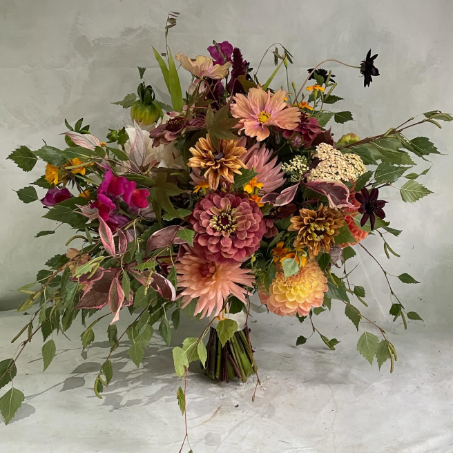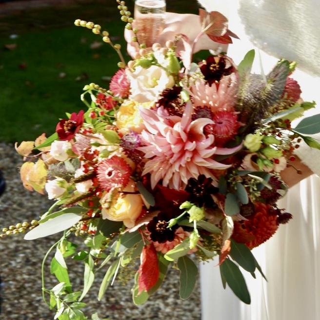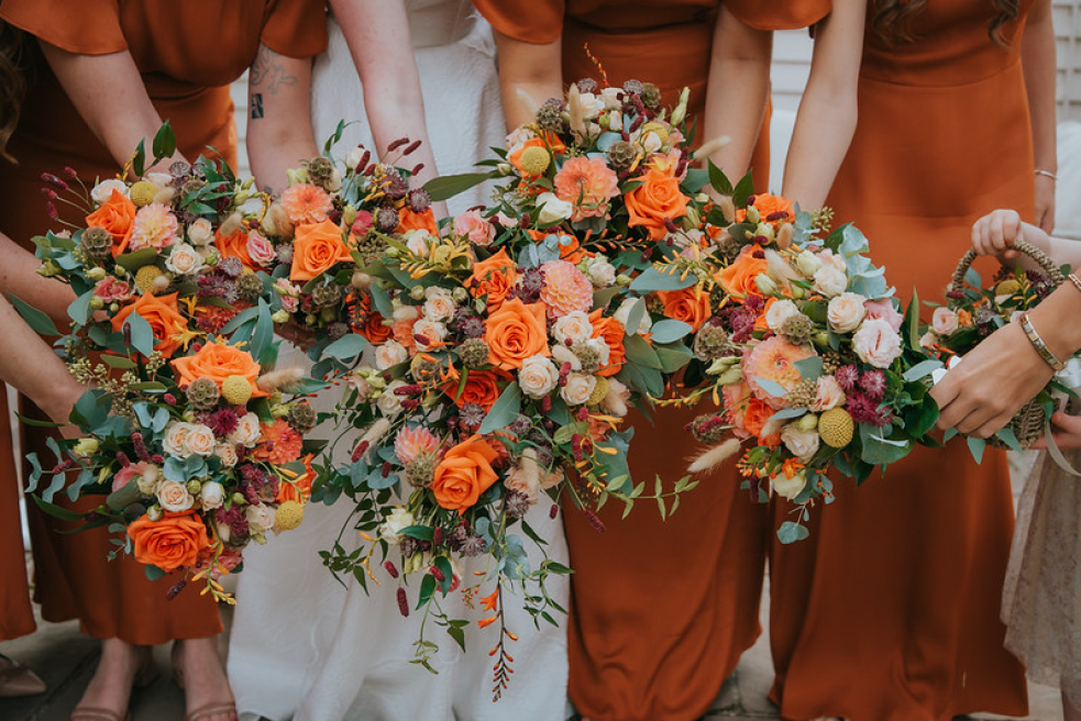 Warm-toned wedding flowers featuring rich colours, seasonal foliage and natural texture.