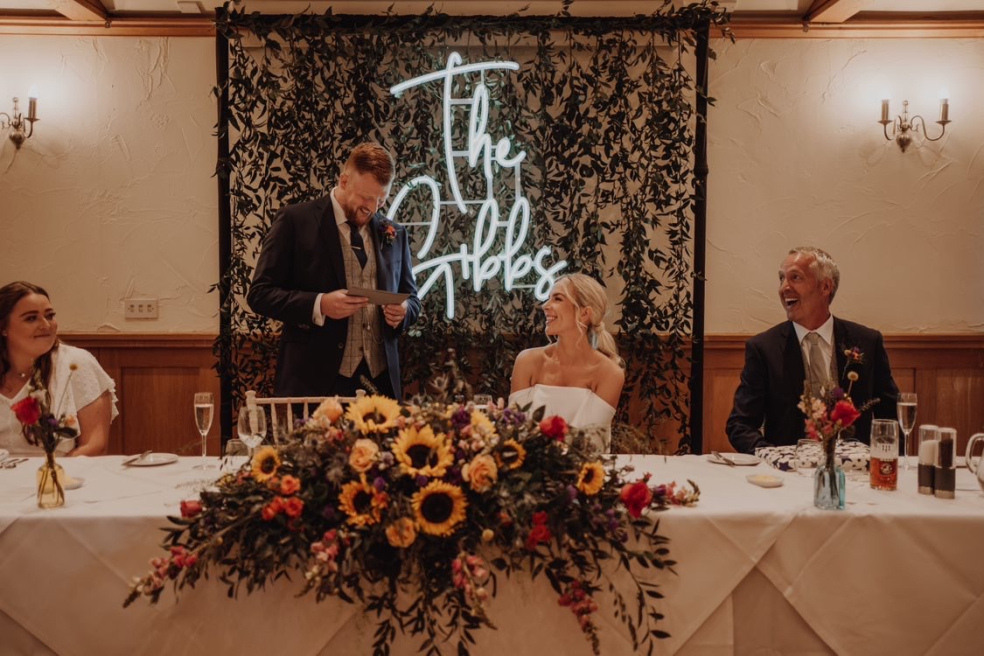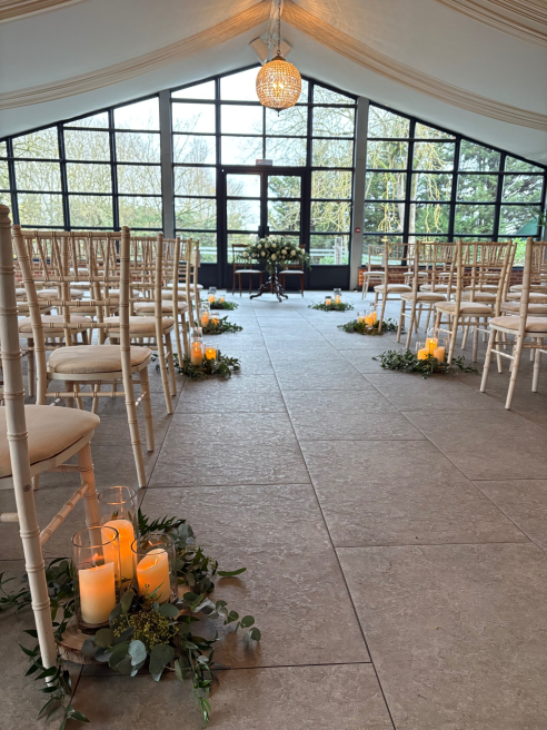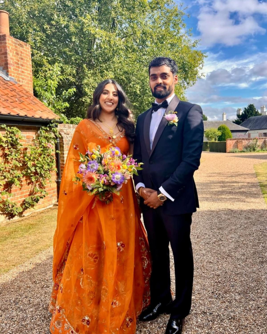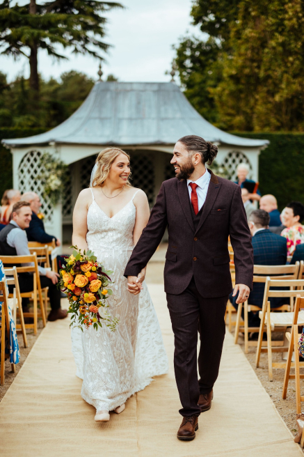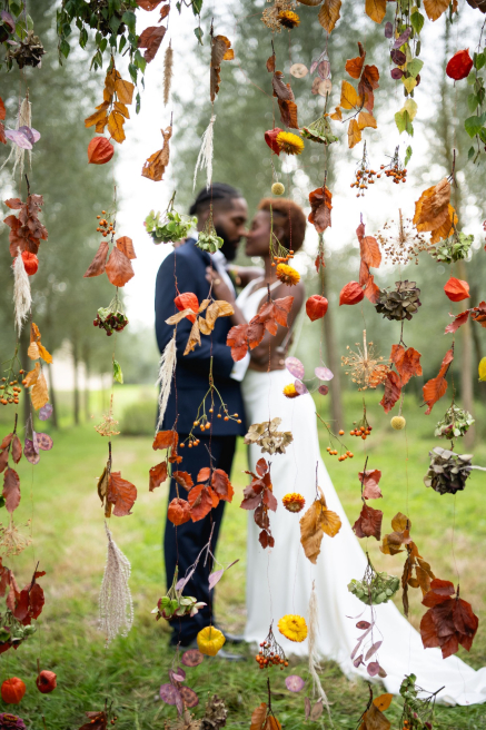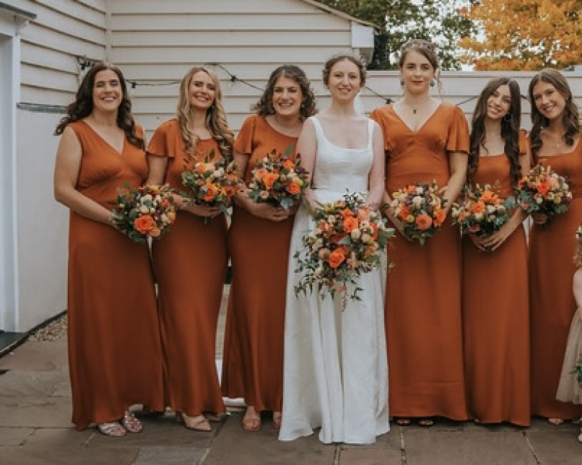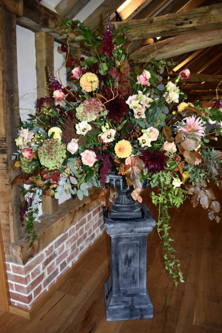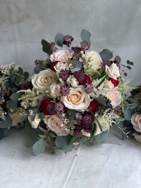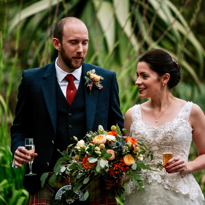 Warm-toned wedding flowers featuring rich colours, seasonal foliage and natural texture.